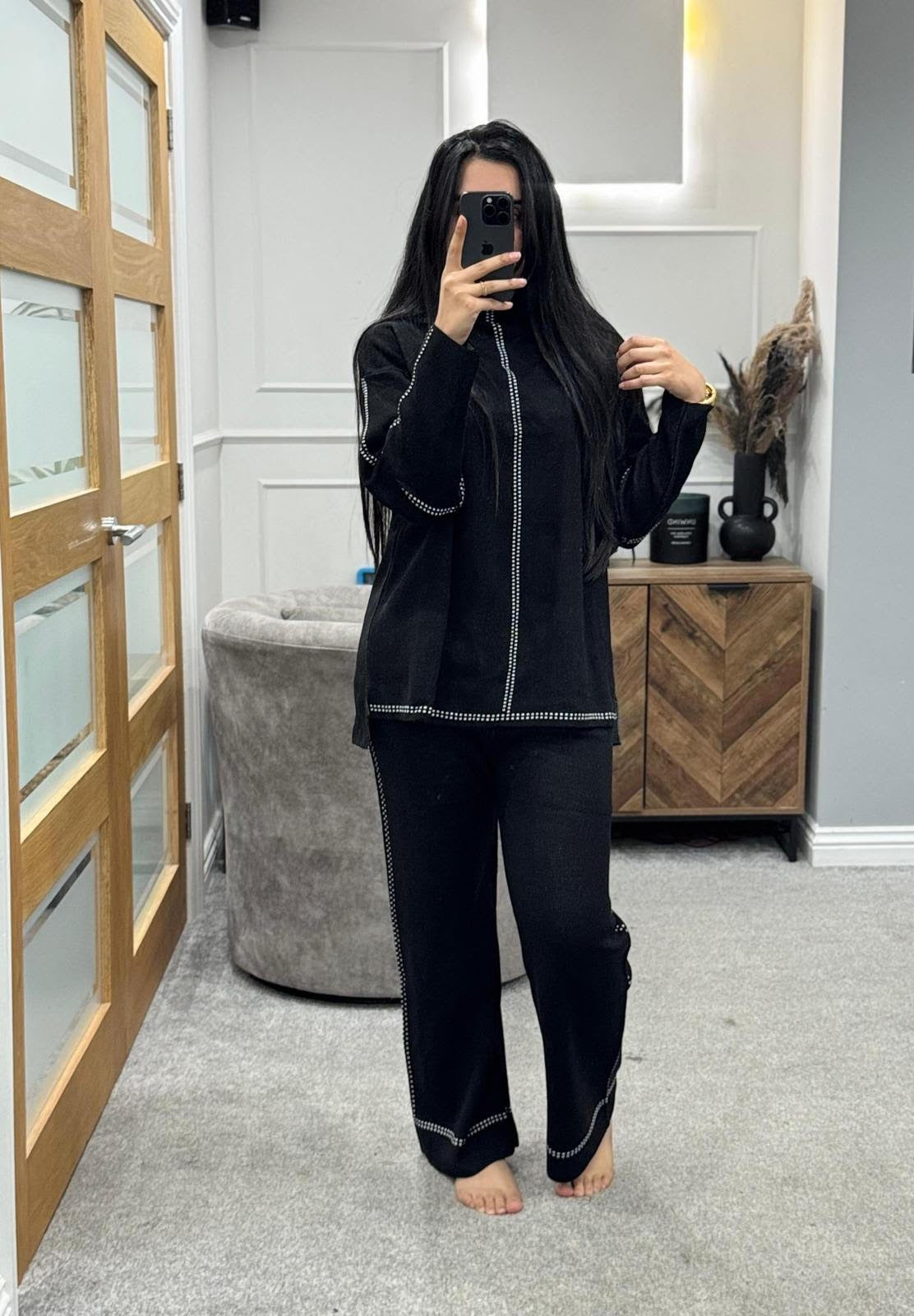 Crafted from premium wool, this tailored co-ord set features a sleek top and matching bottoms with subtle white line detailing. Soft, warm, and effortlessly stylish — a polished look for any occasion.