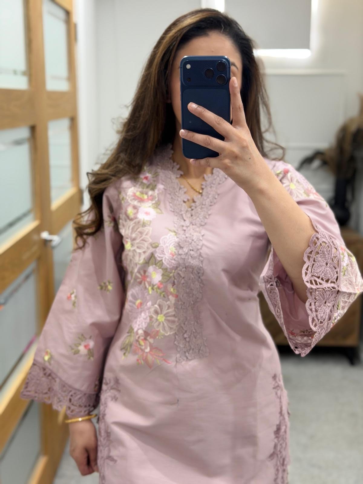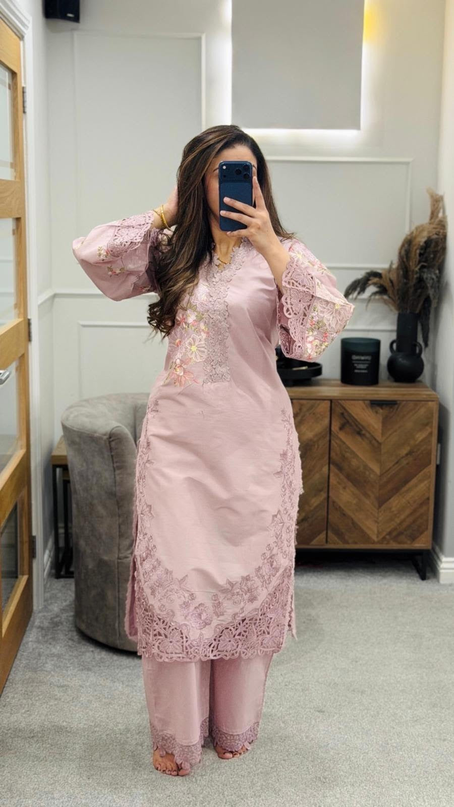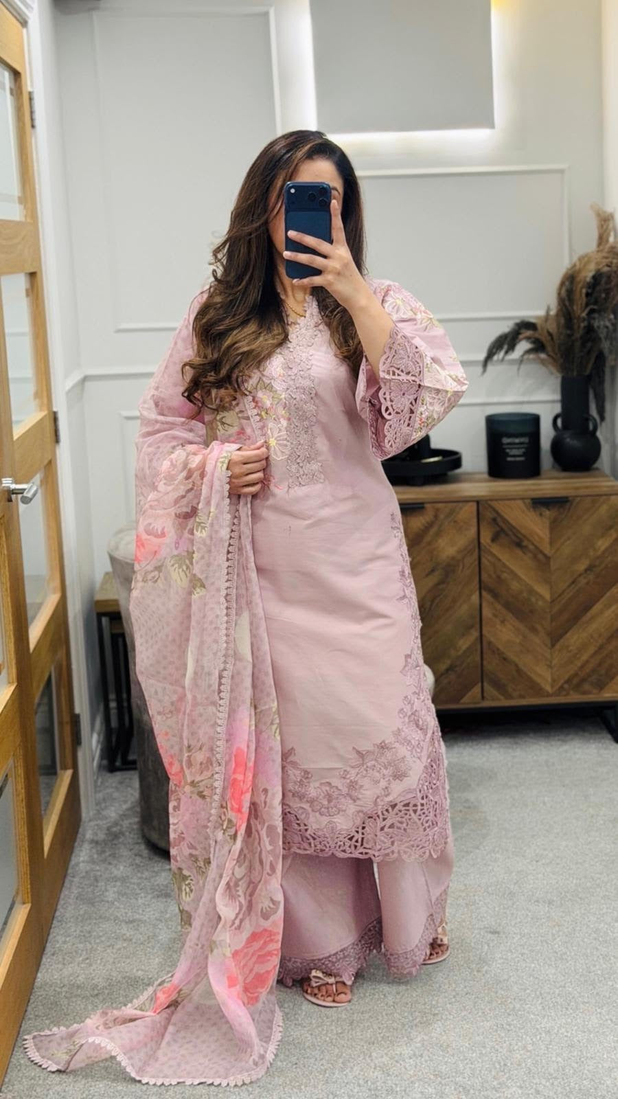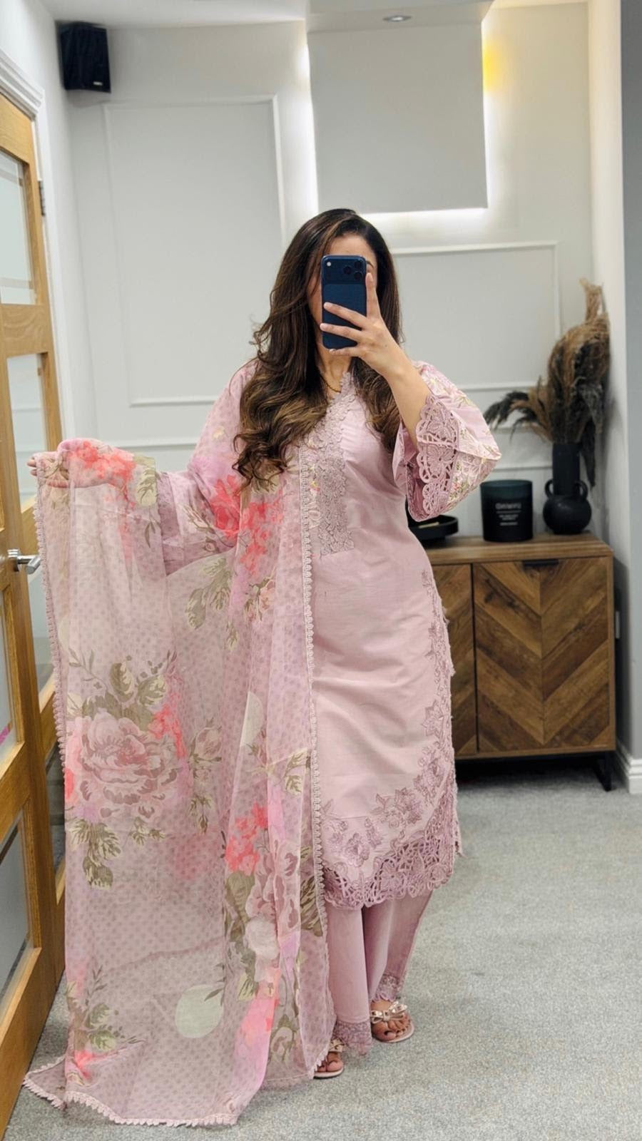 Paired with a coordinated dupatta and tailored trousers, it offers a flawless silhouette perfect for festive occasions and elegant gatherings alike.