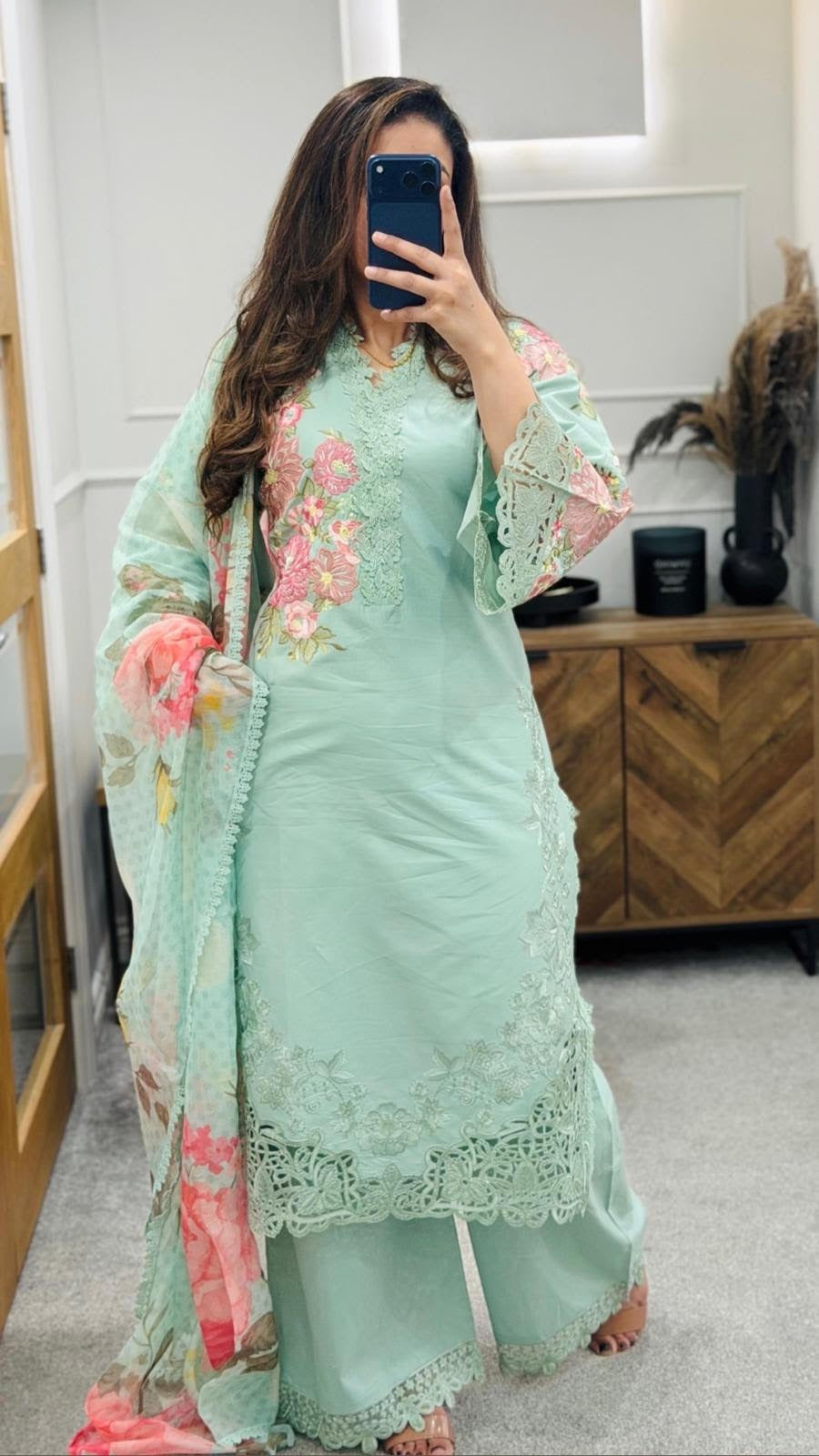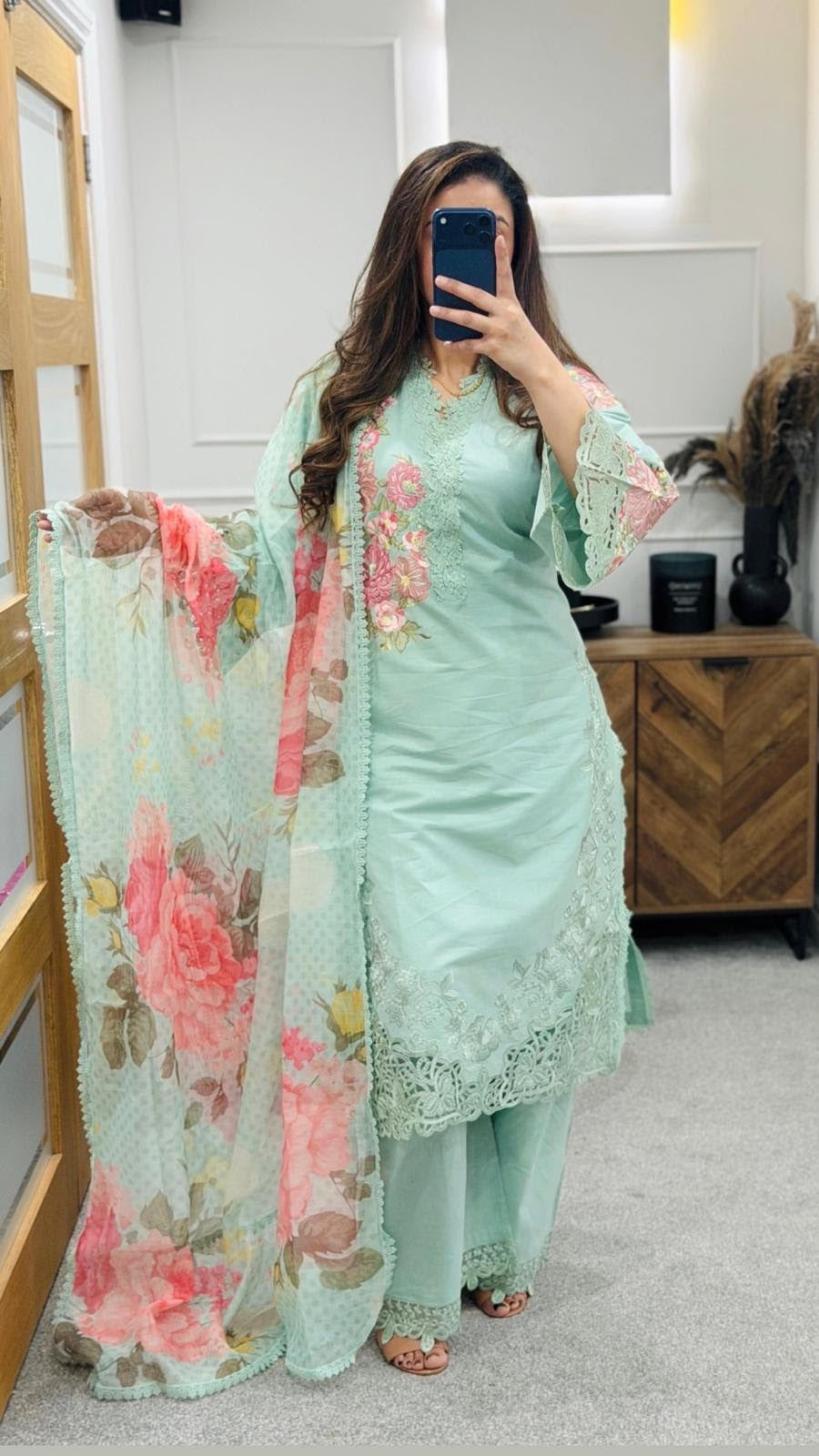 Paired with a coordinated dupatta and tailored trousers, it offers a flawless silhouette perfect for festive occasions and elegant gatherings alike.