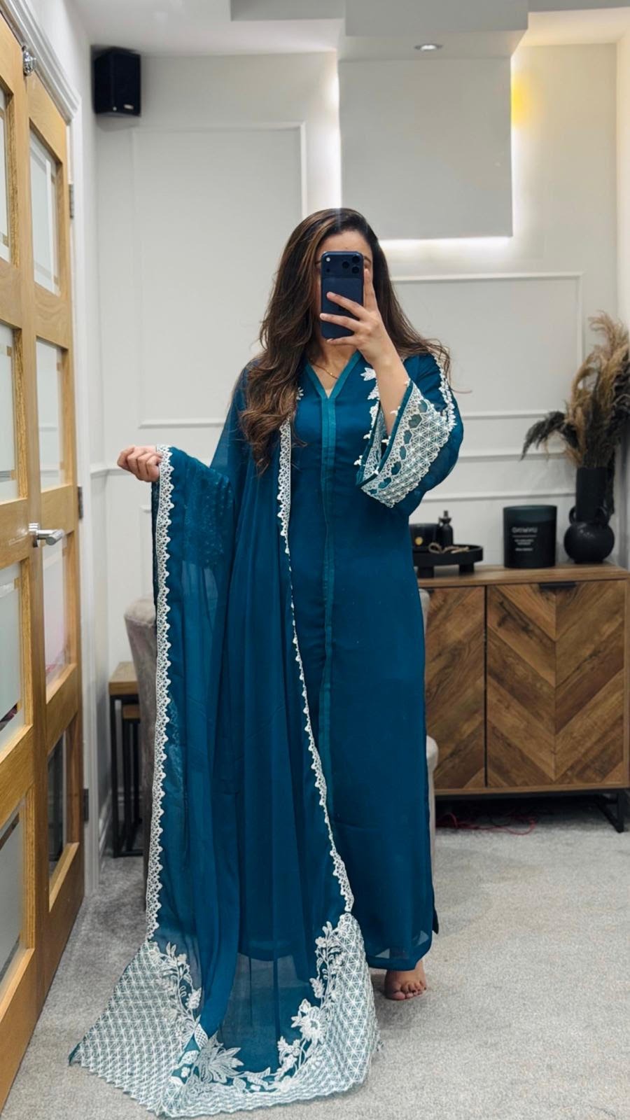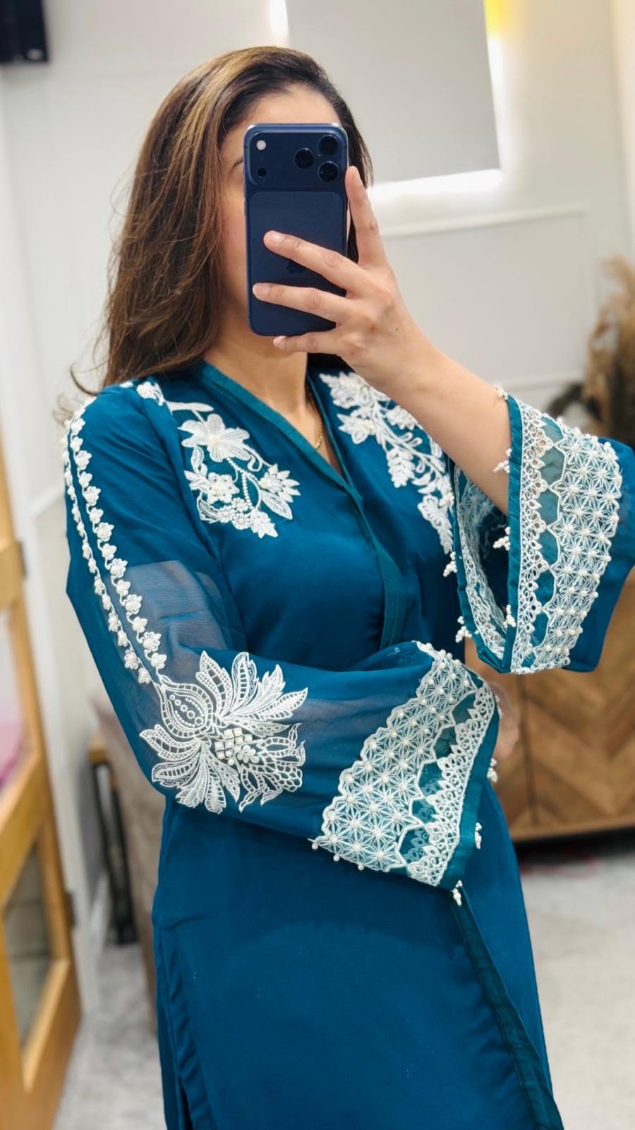 An elegant chiffon 3-piece dress set designed for timeless grace and effortless sophistication. The ensemble features a beautifully embroidered kameez crafted from soft, airy chiffon, paired with a comfortable matching inner and a flowing chiffon dupatta that adds a delicate, ethereal finish. Intricate embroidery along the neckline, sleeves, and hem enhances the design with refined detail, often highlighted by subtle threadwork and light embellishments. Lightweight yet luxurious, this outfit drapes beautifully and moves with ease, making it an ideal choice for festive celebrations, weddings, and formal gatherings