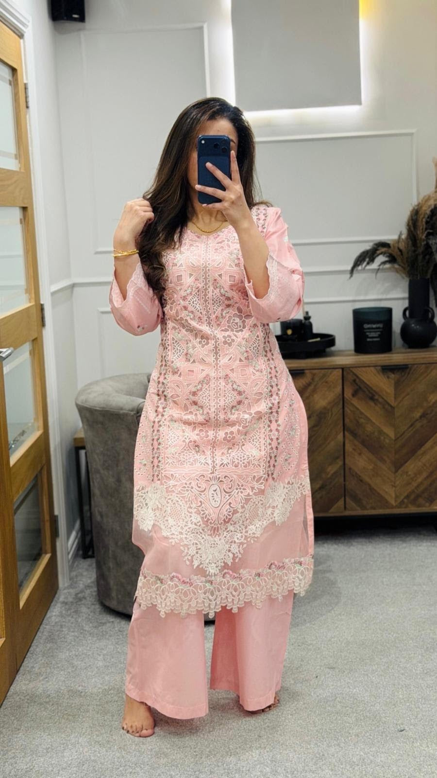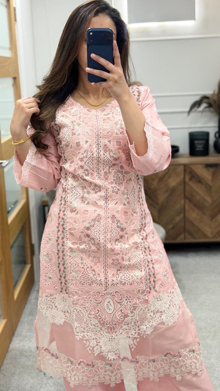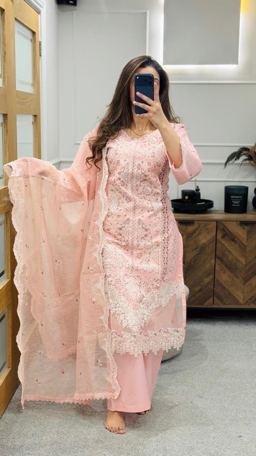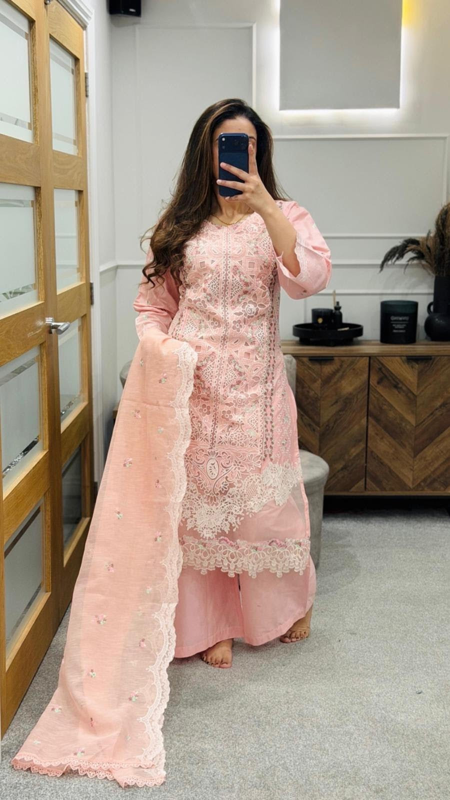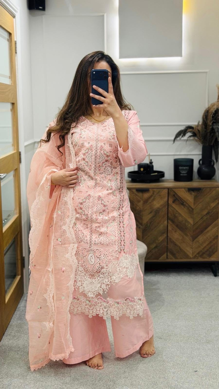 Refined and effortlessly graceful, this luxury cotton 3-piece suit features a beautifully embroidered kurta paired with a comfortable bottom and matching dupatta. Crafted from premium cotton for breathable comfort, the intricate detailing adds a touch of sophistication—perfect for daytime festivities and elegant occasions