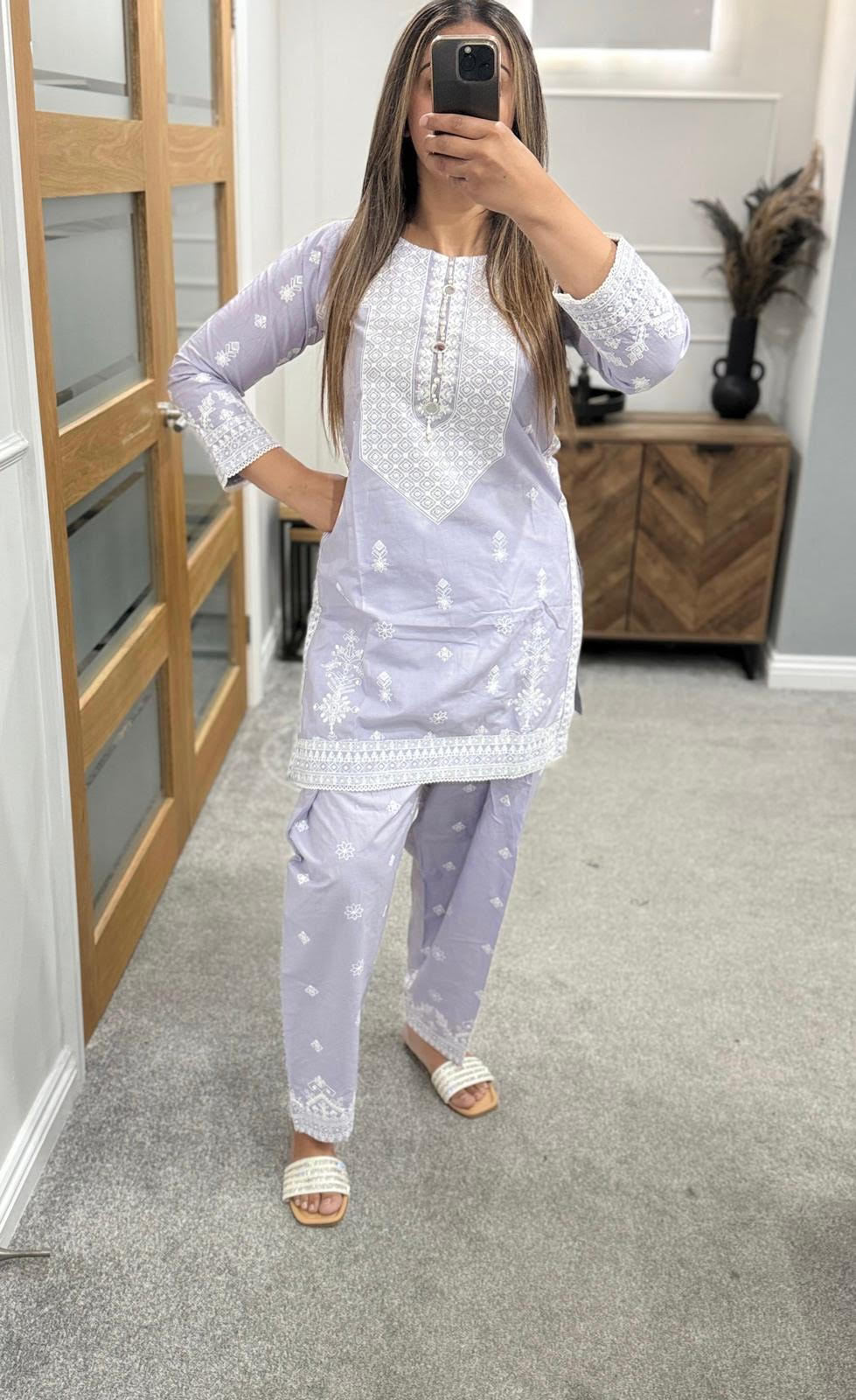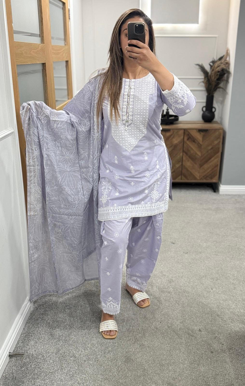 Freshen up your wardrobe with this lilac lawn embroidered suit, a perfect pick for sunny days. The soft lilac shade pairs beautifully with delicate embroidery, adding just the right amount of detail. Light, airy, and effortlessly stylish, it comes with a matching dupatta and trousers—ideal for brunches, casual events, or everyday elegance.